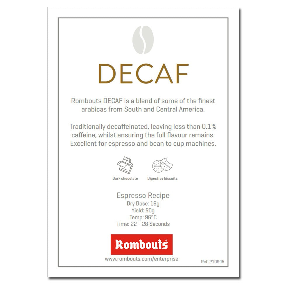 Rombouts Original blend but with less than 0.1% caffeine. This is an aromatic blend of some of the finest Arabicas from South and Central America. Excellent for espresso, bean to cup and filter machines.