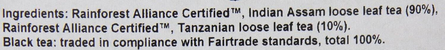 Rainforest Alliance Certified, Indian Assam loose leaf black tea (90%). Rainforest Alliance Certified, Tanzanian loose leaf black tea (10%).