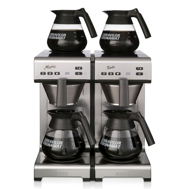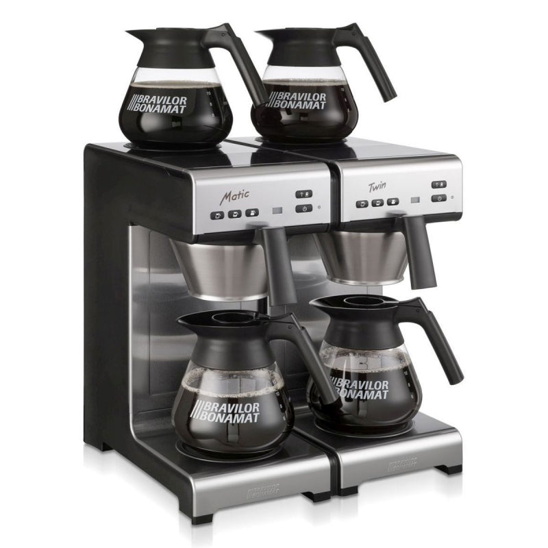 Quick filter machine with connection for mains water supply 3/4 inch. Fitted with digital programming, selection keys 2-12 cups, coffee-ready signal and descaling indicator. Includes glass decanters and stainless steel fiterpans.